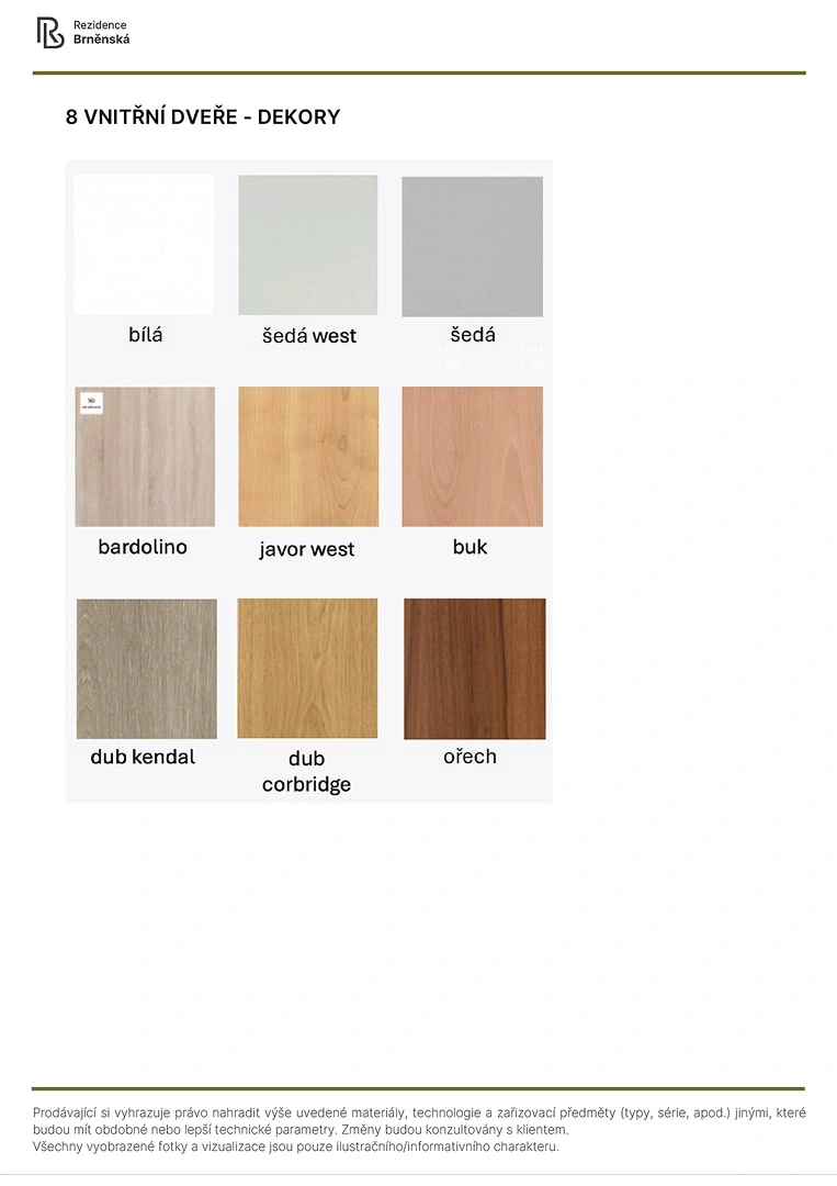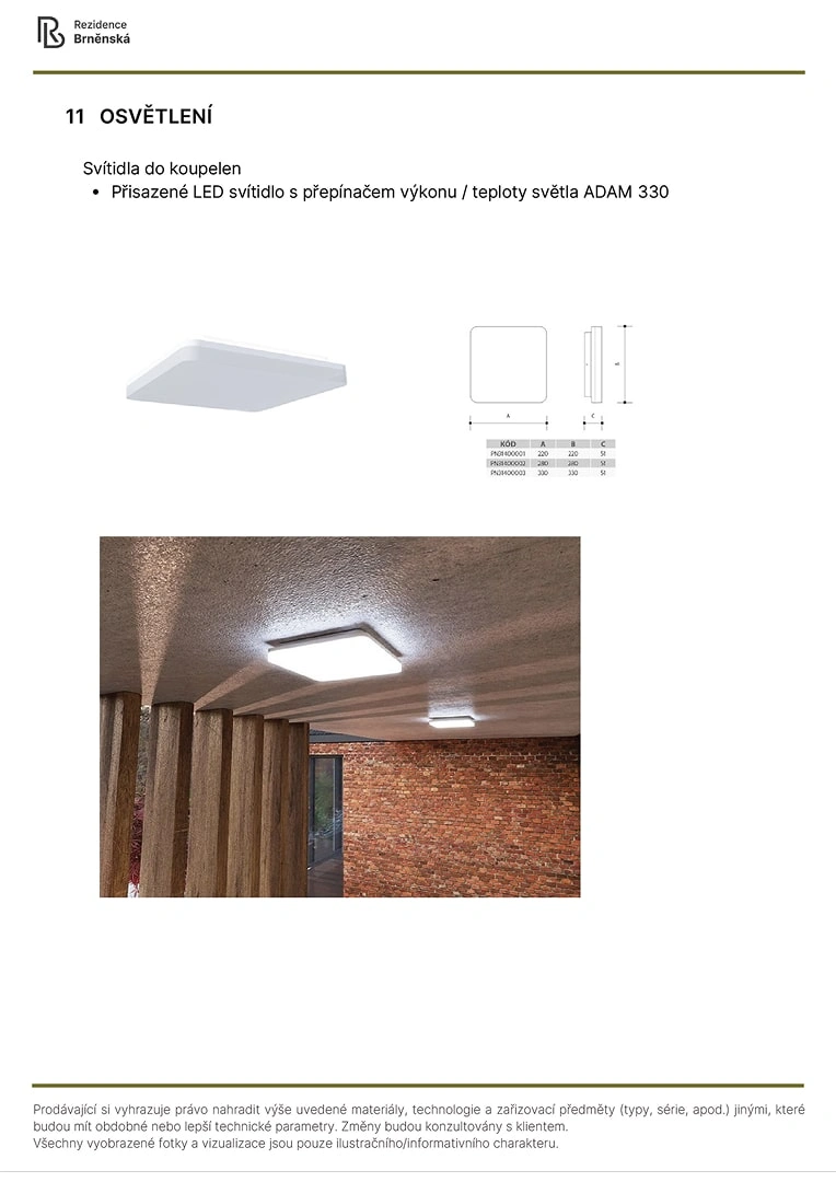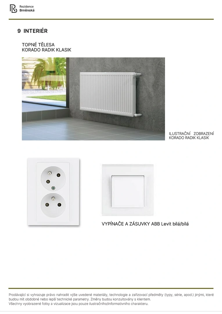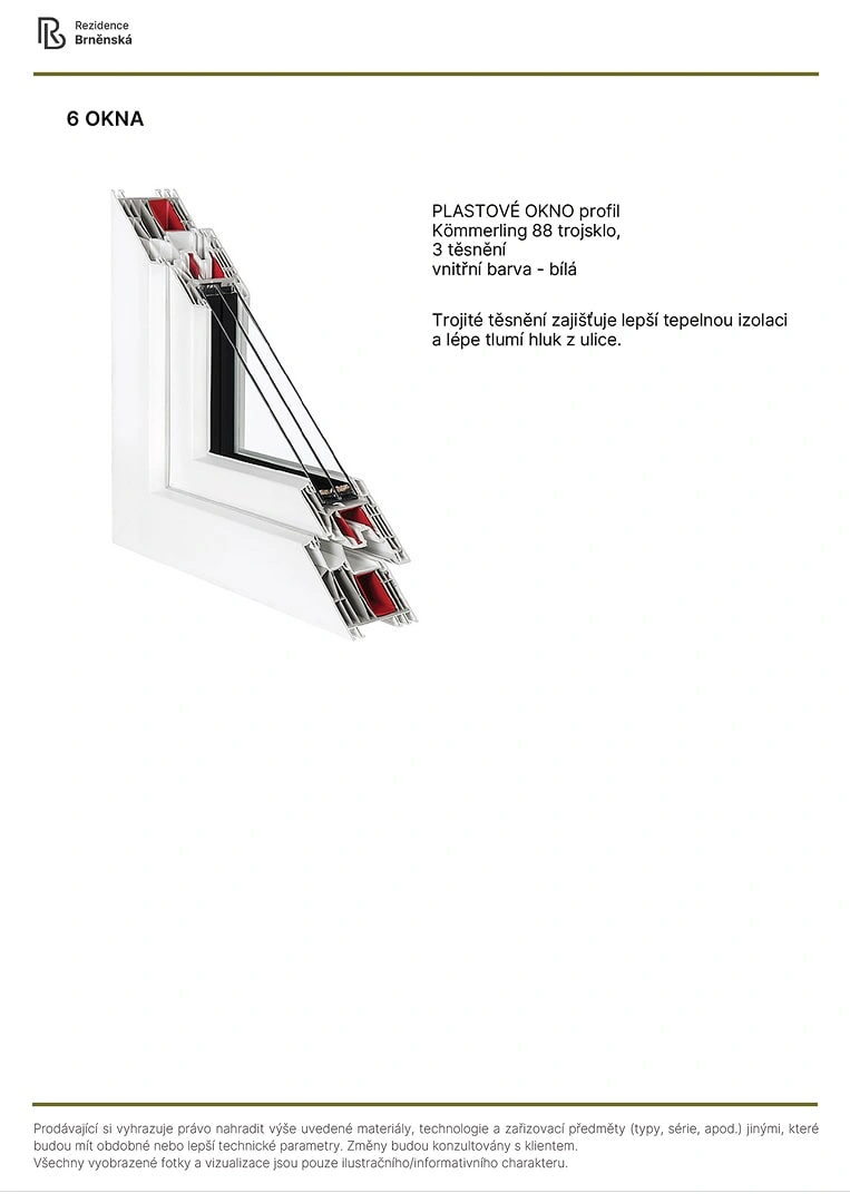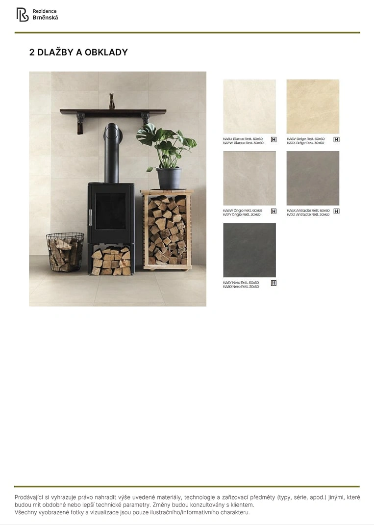 Prodávající si vyhrazuje právo nahradit uvedené materiály, technologie a zařizovací předměty alternativami s podobnými nebo lepšími technickými vlastnostmi. Konečná podoba stavby se může lišit od původních schémat a půdorysů, zejména pokud původní materiály nejsou dostupné nebo byly vyřazeny z výroby. V případě, že standardy nejsou specifikovány, budou použity standardy uvedené v projektu. Fotografie a vizualizace slouží pouze jako ilustrativní příklady.
