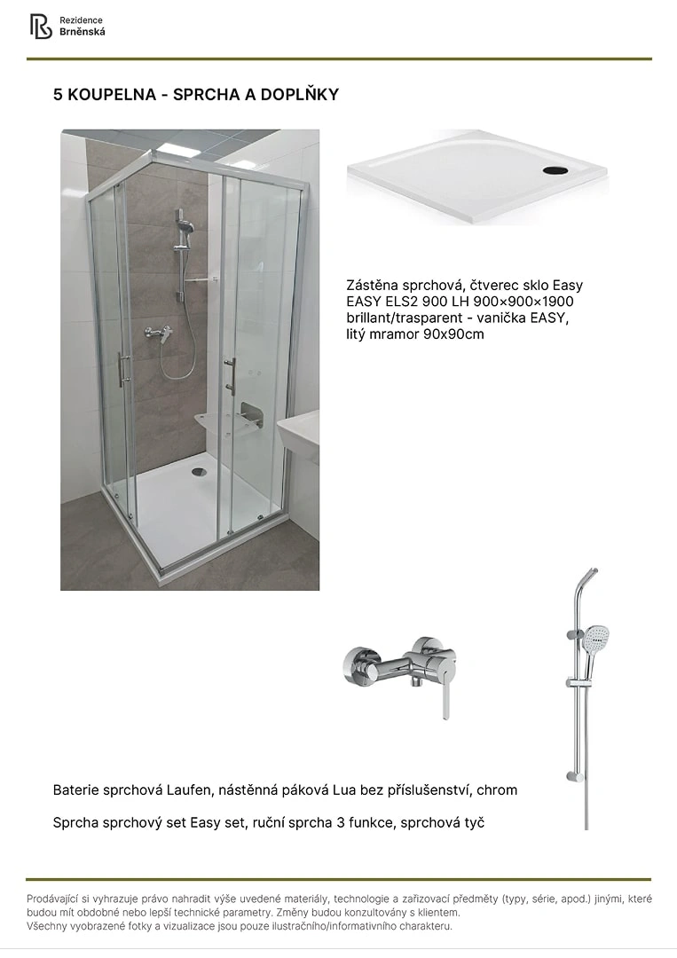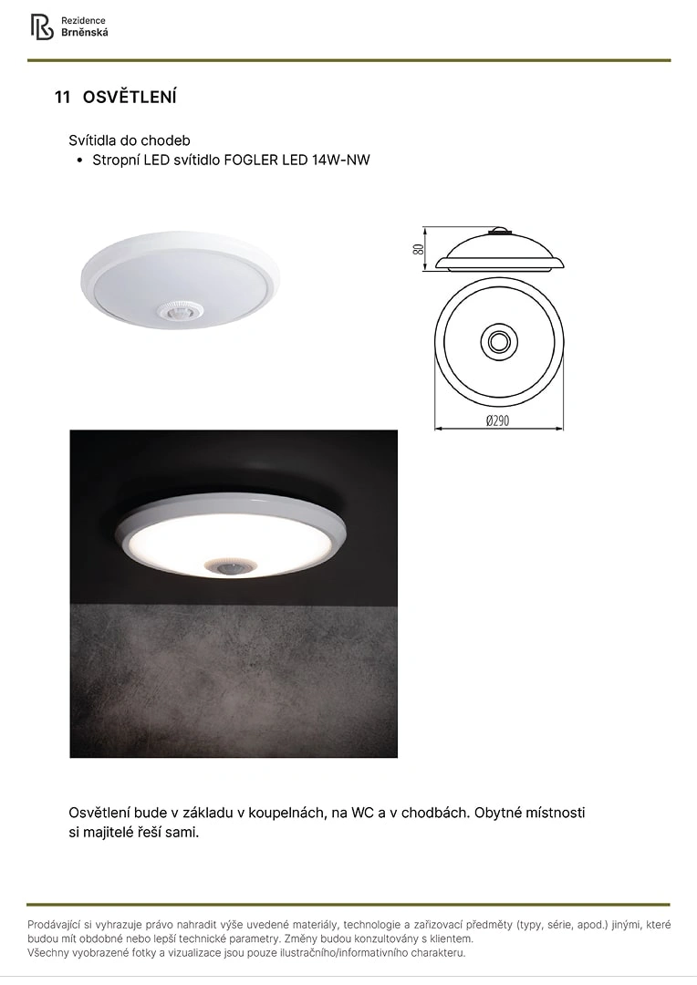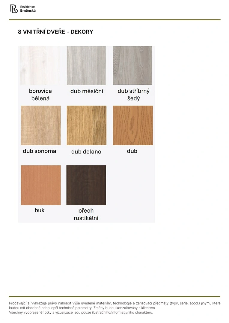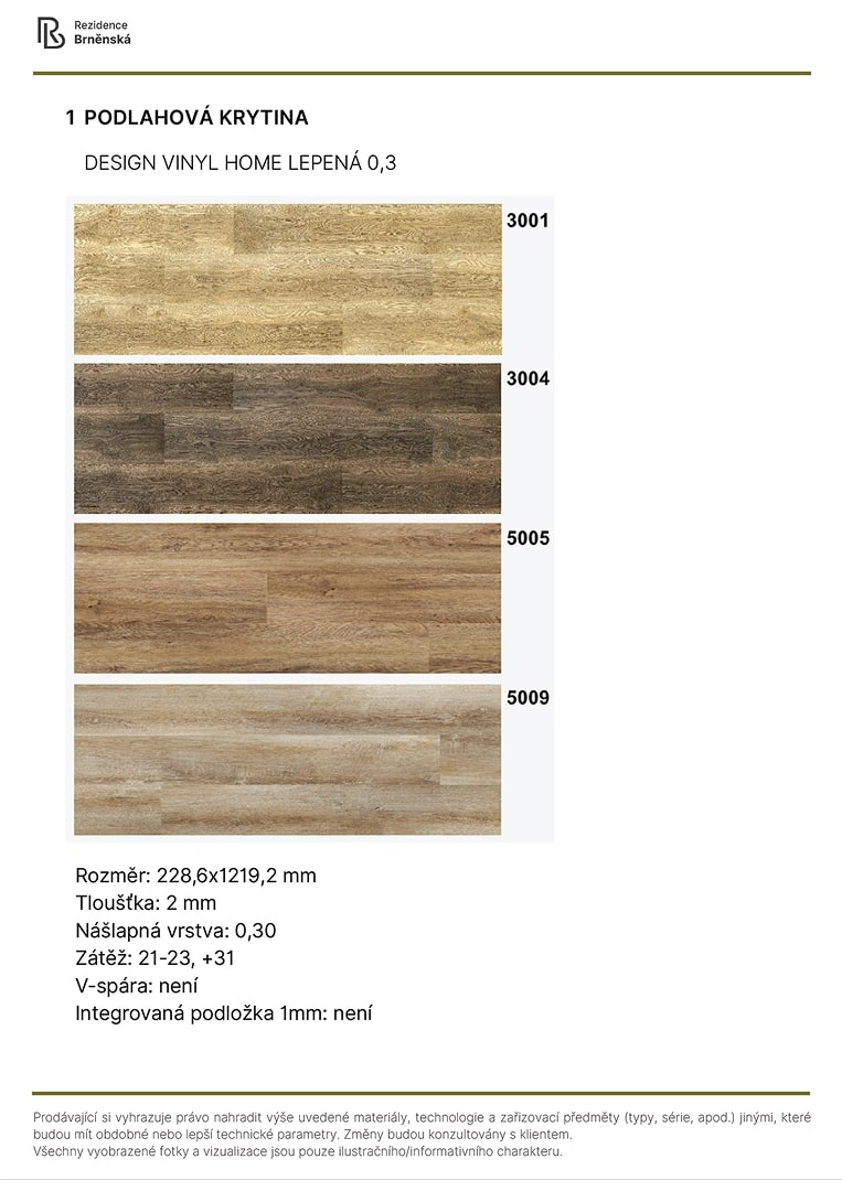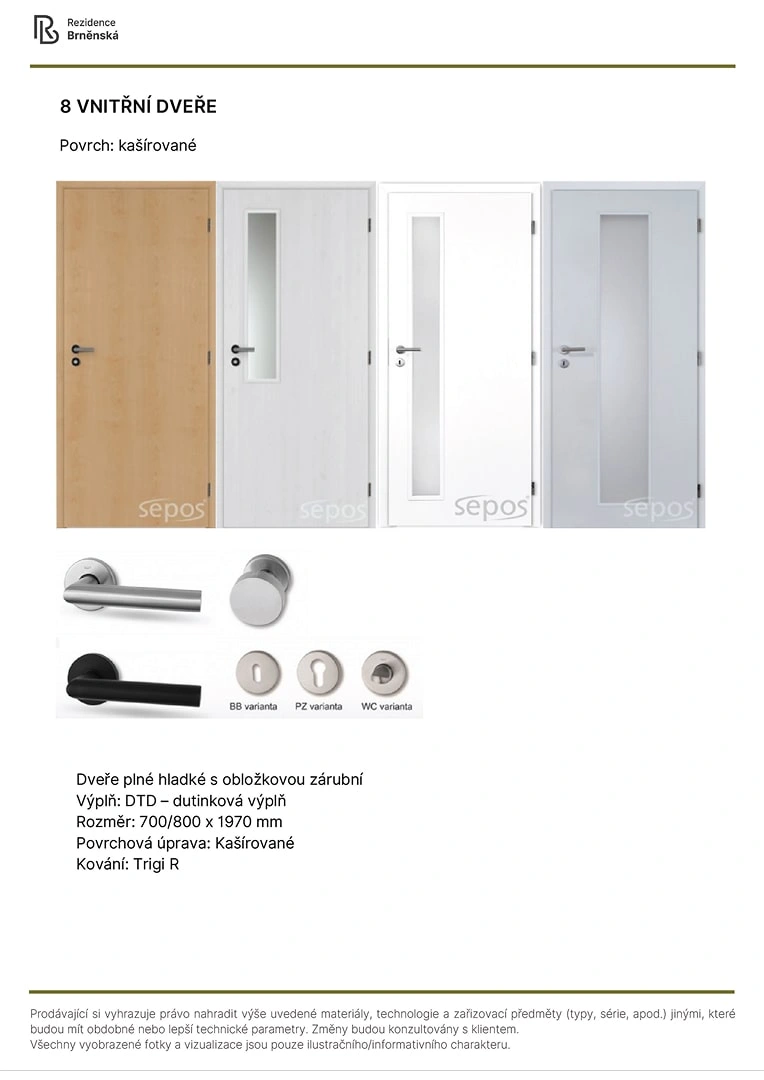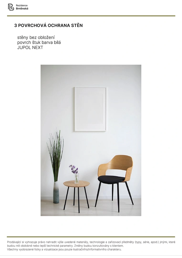 Prodávající si vyhrazuje právo nahradit uvedené materiály, technologie a zařizovací předměty alternativami s podobnými nebo lepšími technickými vlastnostmi. Konečná podoba stavby se může lišit od původních schémat a půdorysů, zejména pokud původní materiály nejsou dostupné nebo byly vyřazeny z výroby. V případě, že standardy nejsou specifikovány, budou použity standardy uvedené v projektu. Fotografie a vizualizace slouží pouze jako ilustrativní příklady.