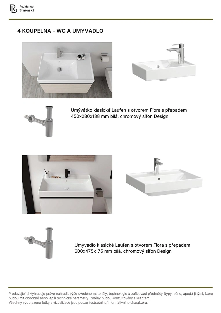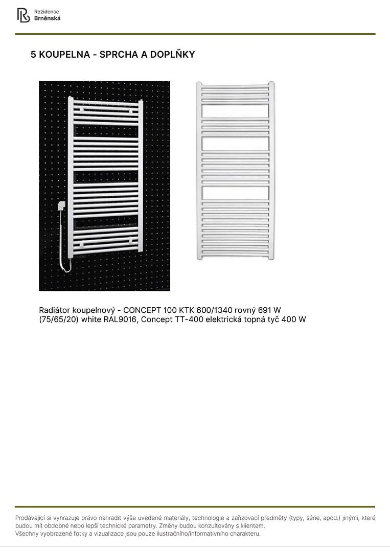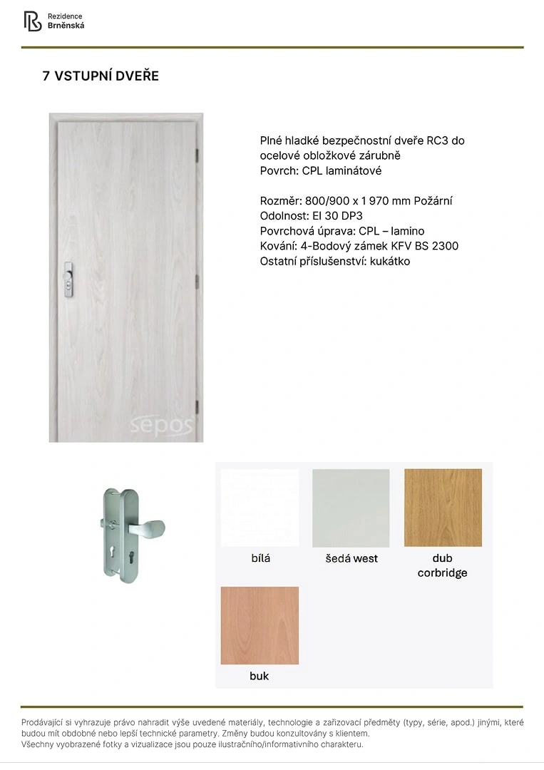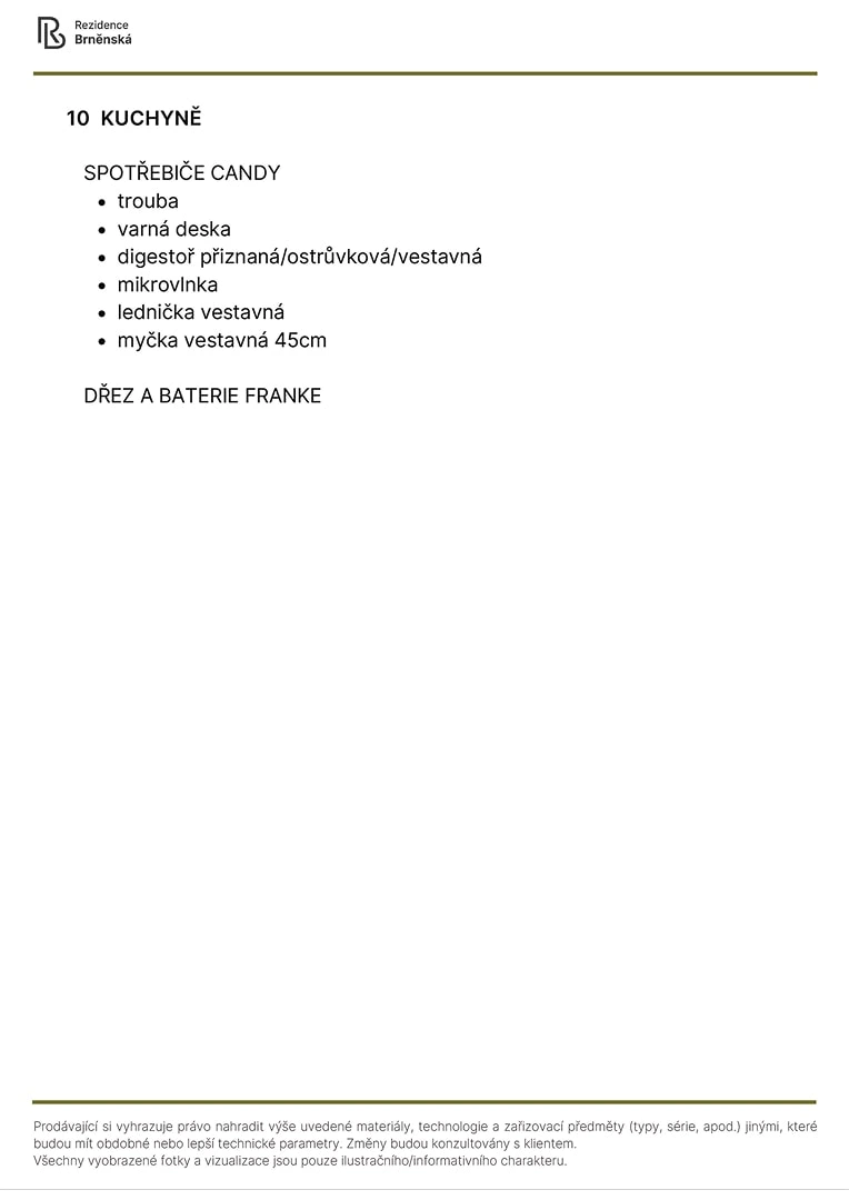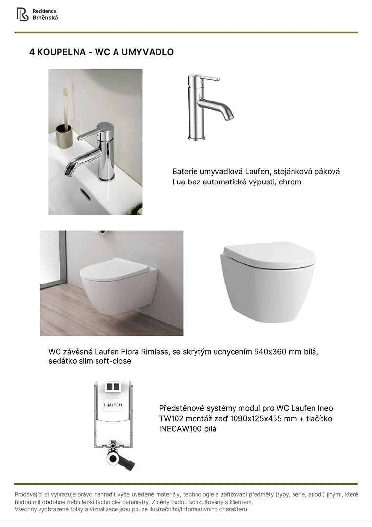 Prodávající si vyhrazuje právo nahradit uvedené materiály, technologie a zařizovací předměty alternativami s podobnými nebo lepšími technickými vlastnostmi. Konečná podoba stavby se může lišit od původních schémat a půdorysů, zejména pokud původní materiály nejsou dostupné nebo byly vyřazeny z výroby. V případě, že standardy nejsou specifikovány, budou použity standardy uvedené v projektu. Fotografie a vizualizace slouží pouze jako ilustrativní příklady.